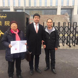 再审宣判后,周远(右),李璧贞(左)和律师在法院前合影。澎湃新闻记者 陈雷柱 图