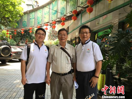 容志行(图中)与民促会两位得力干将民促会秘书长王军(右一)、球迷部主任胡广洪(左一)合影 岳朝莲 摄