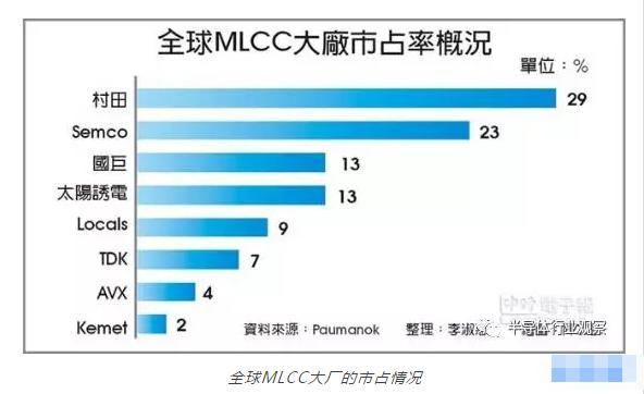 上图显示,全球MLCC格局第一梯队为日本村田,韩国三星,太阳诱电,TDK等;第二梯队为台湾厂商国巨,华新科等;第三梯队才是大陆厂商风华高科,宇阳科技为代表。