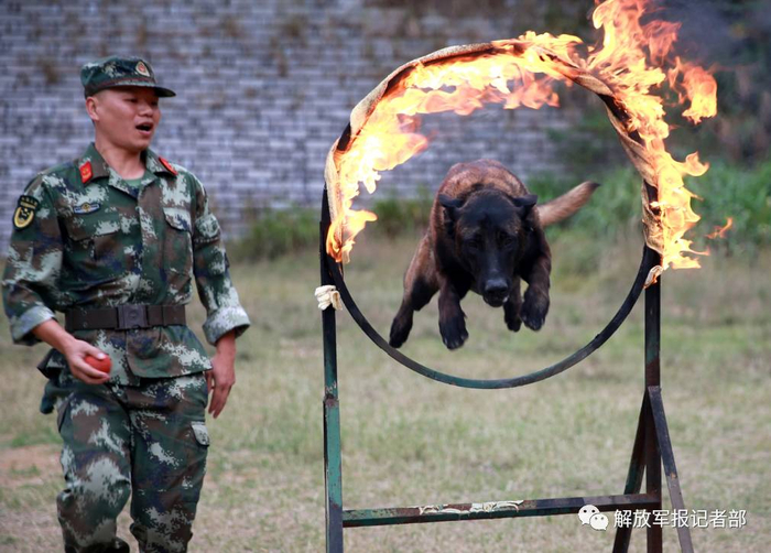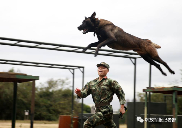 为了让这只小德牧有一种先声夺人的气势,小杨给它取名为“呼啸”。由于“呼啸”身体瘦弱、反应力较差,刚开始连坐、卧、匍匐前进等基础性课目都学不会。看着别的战友的犬动作灵活、进步神速,小杨颇感有些恨铁不成钢,几次气得要揍“呼啸”。生气归生气,小杨还是继续想办法调动“呼啸”的训练积极性。他用津贴买来肉骨头,包裹在毛巾里,训练“呼啸”的攻击性扑咬;找来旧罐子装上石子,用声音来训练它的专注和反应能力。不过最困难的还是胆量训练。进行障碍训练时,每次一到断桥,“呼啸”就停下来,对两米的距离望而却步。这可急坏了一旁的小杨。