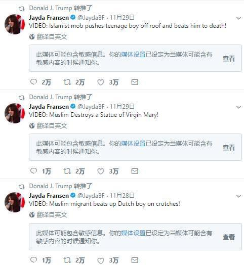 2017年11月29日,美国总统特朗普在社交平台推特上连续转推了三则反穆斯林视频,这些视频是由英国极右组织“英国优先”的副主席弗兰森发布的。