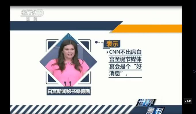 27日,特朗普又在社交媒体上说,美国有线电视新闻网应该去争夺“假新闻大赛奖杯”。当天,CNN回应说,将不出席白宫圣诞节媒体宴会。白宫新闻秘书桑德斯在社交媒体上表示:CNN不出席白宫圣诞节媒体宴会是个“好消息”。