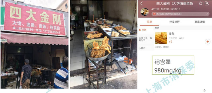 四大金刚(大饼油条粢饭豆腐浆)地址:成山路351弄8号的1件样品的铝含量比较高,为980mg/kg之间。