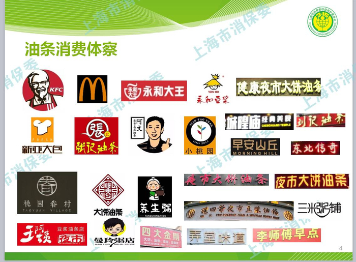 本次消费体察从肯德基、麦当劳、永和大王、新亚大包等连锁餐饮店以及桃园眷村、张记油条、健康夜市大饼油条等网红店铺购买了25个品牌的29件样品。除了对产品宣传进行调查之外,还委托上海市营养食品质量监督检验站对油条成分进行了检测。