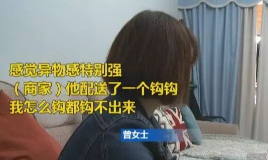 曾女士称, “戴的时候不是很顺利,试了几次戴进去了。照了镜子确实还是很有效果,然后我想把它拔出来,因为感觉异物感特别强,(商家)他配送了一个钩钩,却怎么钩都钩不出来。”