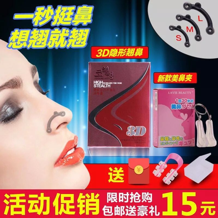 有的商家还宣传,这个东西是韩国原装进口,材料绝对天然安全。其中销量最好的一款价格仅为15元,已交易成功8000多笔。根据商家的宣传,新一代“美鼻神器”像取戴隐形眼镜一样方便,任何年龄段,不用担心鼻子已经定型,有拉拢鼻孔、收缩鼻翼、翘鼻尖的作用。