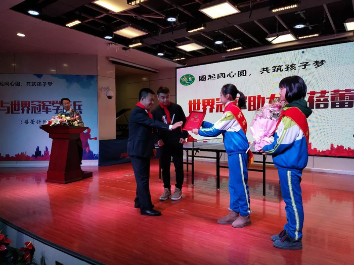 12月4日,长春市南关区树勋小学开展了“圈起同心圆,共筑孩子梦——世界冠军助力‘蓓蕾计划’”主题活动。当天,在学校多功能活动室内,“王皓乒乓球推广项目”落户树勋小学并进行了揭牌,同时,王皓还被树勋小学聘为“终身名誉校长”。