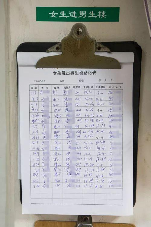 值班室里的《女生进出男生楼登记表》,徐根娣说,学校有规定,女生可以在下午2点至5点期间登记进入男生楼,但是男生不可以进入女生楼。 记者 陈中秋 摄 (来源:都市快报)
