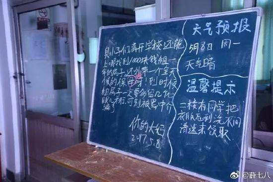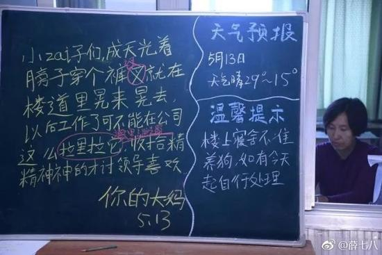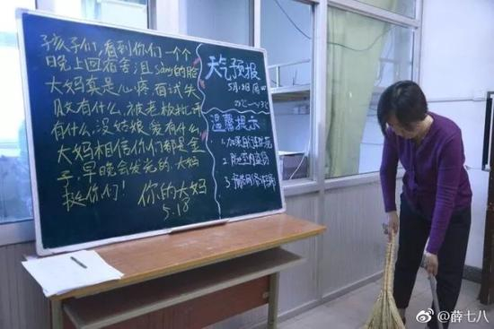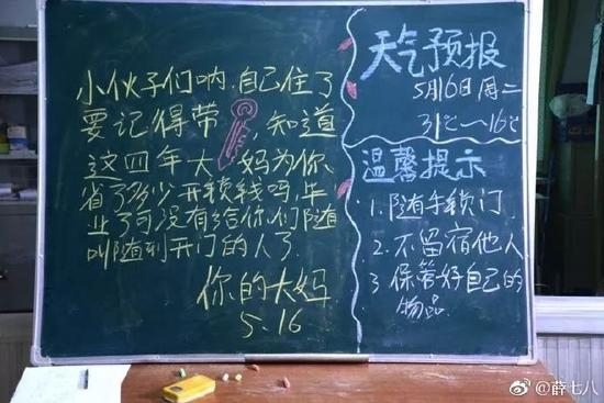 网友@薛七八在社交媒体上晒出一组宿管大妈的黑板留言。黑板上除每天都有的“天气预报”和“温馨提示”,还有宿管大妈对即将毕业的学子们的“唠叨”,虽然其中还有些错字和拼音,但语言朴实,每天不重样。