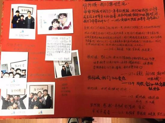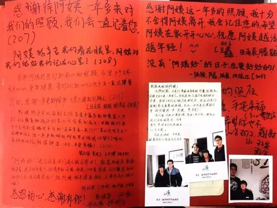 孩子们还买了个“签字本”。全楼层所有学生都想在上面留下和徐阿姨在一起的点滴、故事,签字本不够用,只能附上纸贴在上面。