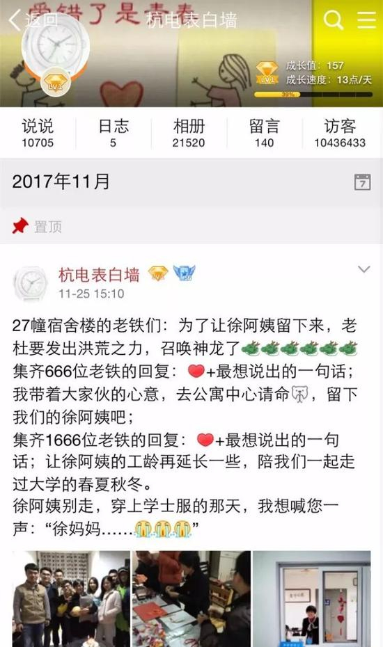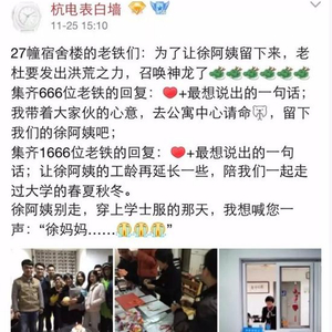 12月1日,杭州电子科技大学官方微信公众号发了一篇题为《点赞杭电人!宿管阿姨退休,800多学生“请愿”让她留下来》的文章,历数了徐阿姨和这幢楼学生们的点点滴滴。文章的最后,发布了一条“好消息”:“因同学们的强烈请求,征询了徐阿姨的意见之后,杭电文一教育发展有限公司研究决定,返聘徐阿姨继续工作,她的工作岗位还在27号楼。”