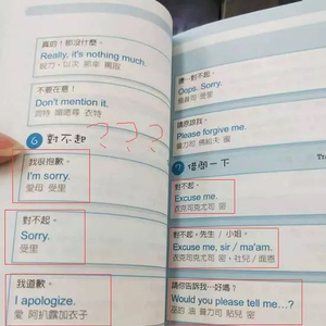 课本中,“I'm sorry”(我很抱歉),底下发音标注着“爱母,受里”;“Excuse me”(对不起),则标注着“衣克司克尤斯 密”;“I apologize”(我道歉),则是“爱,阿扒露加衣子。”