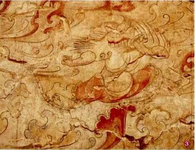 以元氏墓志榜题其名的“奇怪”为比照,壁画“烏獲”前方一个怒目奋翅的怪鸟,便是“唅噙”。驭龙仙人前面开路的一个,也可与墓志中的“拓遠”对应。其实壁画中的“奇怪”,都可以如此类比。推想壁画的绘制,应是工匠既有一个流行的粉本以及名目可依凭,又有充分的发挥想象之空间。