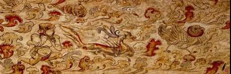 再看以各类图像资料,从汉画像石到南北朝墓葬雕刻与壁画构成的叙事系统,与文献多是可以对应的。忻州壁画墓中的“图画天地,品类群生,杂物奇怪,山神海灵”,也是如此。手持麈尾飞步在云端的羽人,骑鹤驰骋的女仙,驭龙而行的仙人,又西壁的仙人骑鱼,或即《列仙传》中的琴高。凡此种种,俱可属之于“图以云气,画彩仙灵”。东壁长发飘潇手持鼓风袋狂奔于云间的风伯,西壁努睛露齿持槌击连鼓的雷公,又有流云腾涌中一个赤身露体的骑龙者,右手倒持一瓶,瓶内水流下注,自是“雨师泛洒”。此则“天官景从”也。