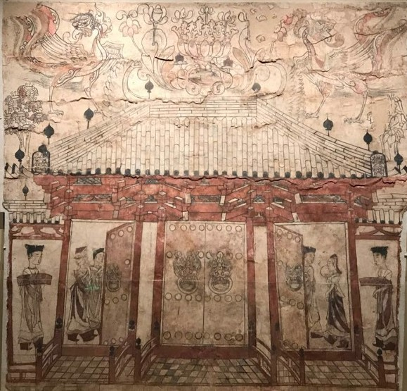 壁画墓中最引人注目的画迹,是甬道拱门周边和顶部所绘砖墙之上一座极有气势的木构建筑,即庑殿顶三开间的门楼,两侧有廊相连,应是表现宫门。《洛阳伽蓝记》卷一曰城内之永宁寺,“南门楼三重,通三阁道,去地二十丈,形制似今端门”,可知北魏宫门之概。壁画中的宫门正脊两端各一个硕大的鸱尾,鸱尾之间和两边垂脊上竖着宝珠头的瓦钉。垂脊之端各有一个巨型鬼面瓦。正门紧闭,侧门半开,门扇各有四路门钉,一对衔环铺首。门廊彩砖墁地,设有六道宝珠望柱的朱栏。柱顶施斗栱,柱间阑额施补间铺作亦即叉手。木构件之间又细笔绘出网状物,似即表现用于防备鸟雀做窝的罘罳,虽然它原应设在木构件之外,只是那样未免难以行诸画笔。