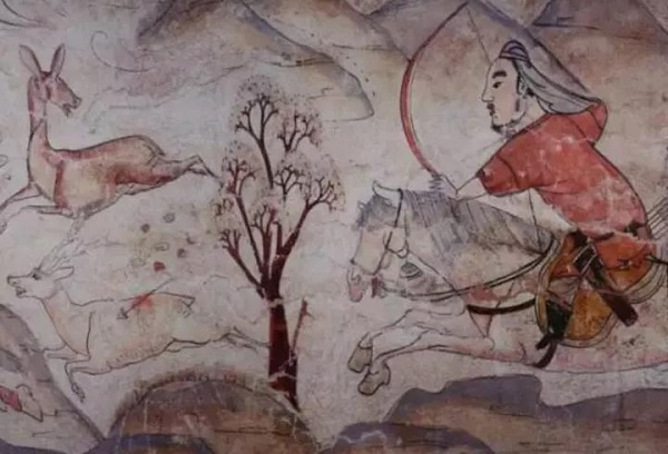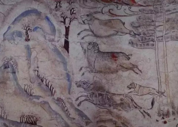 墓道东西两壁长卷式的校猎图,最见壁画设计者的匠心。虽然不少场景在汉代即形成图式,但画工在沿用既有图式的同时,又挥洒写实之笔,令它别现当代特色。比如骑马引弓反身射虎的形象(此或被称作“安息射”),在河北定县第 122 号西汉墓出土金银错铜狩猎纹伞盖杠箍纹饰中,已具见精采。