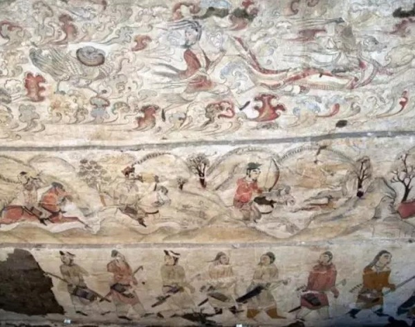 东西两壁,画面自上而下界为四层。第一层,图画仙人灵怪与奇禽异兽;第二层,分作南北两段,北段为苑囿校猎,南段为群侍;第三层绘仪卫;第四层,西壁为武士,东壁画面被盗洞所毁。近年山西数座北齐壁画墓的发现,使得今人对北朝画迹的认识被屡屡刷新,忻州忻府区九原岗墓群中的一座北朝晚期大型壁画墓,更以许多前此未见的艺术形象将人们的认识又推进一层。遗憾的是,除却穹隆顶上面的星象图及两壁星星点点的残迹,墓室壁画几乎盗揭殆尽,所幸墓道东、西、北三壁的壁画尚大部存留。