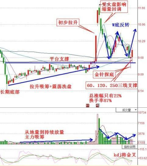 该股在底部从地量开始持续放量,而且股价震荡上行,是典型的边拉边洗。这种方法主力能最低成本吸到最多的筹码。之后主力就配合题材初步拉升20%,为什么是放量大阳拉升不是一字板呢?因为主力想清洗获利盘,又不愿引来太多跟风盘。现在股价受到60、120、250均线支撑和前期平台支撑,出现金针探底K线,测试下方支撑力,而且形成w底反转,kdj金叉,证明上升趋势形成。目前正处于起步阶段,后续会不会强势上涨呢?我们拭目以待
