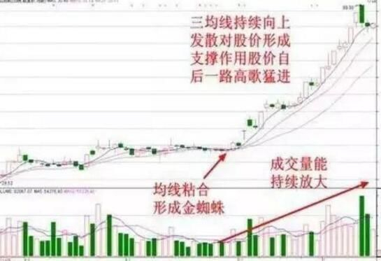 特征:由三条价格平均线扭转向上所形成的结点,该结点朝未来水平方向形成辐射带,对未来股价有支撑作用。该结点朝未来水平方有辐射带,表示为一串方向向上的小箭头,对未来股价有推动作用。
