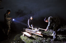 ▲在“扎荒”点,护林员将捡拾来的朽木劈成木柴(11月17日摄)。