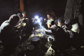 ▲在“扎荒”点,护林员围在一起吃饭(11月17日摄)。