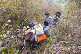 ▲护林员牵着驮有睡袋、食物和设备的驴进山(11月17日摄)。