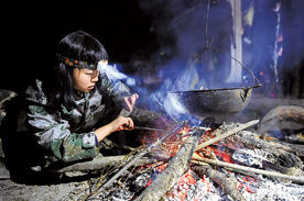 ▲在“扎荒”点,护林员韩雨晨生火做饭(11月17日摄)。