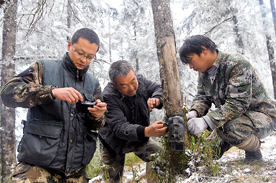 ▲护林员王钧亮(左)、王保佑、王刚(右)更换红外相机储存卡及电池。