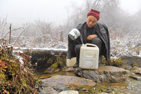 ▲护林员王代军在“扎荒“点附近的泉眼取水(11月19日摄)。
