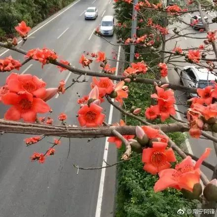 每年三月四月,木棉盛开,木棉多种在南宁一些路段中间的绿化带上,花期只有十几天,有的准备谢了,有的开得正好,也是我们美丽南宁的一抹色彩~