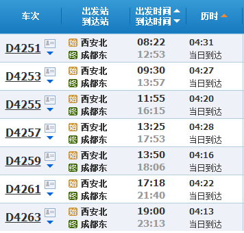 当日,从成都东到西安北对开7趟列车,最早一趟是8时45分开,13时到,列车运行4小时15分;末班是18时26分发车,22时40分到,列车运行4小时14分。