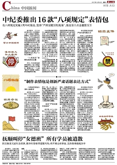 八项规定改变中国,作风建设亮丽明片不断擦亮。在中央八项规定实施五周年之际,中央纪委监察部网站策划一组选题,立体式、多角度宣传中央八项规定精神。表情包是其中一项。这一组16个表情包,既有“巩固拓展中央八项规定精神成果”“反对特权”等体现党的十九大报告新部署新要求的,也有“禁止违规用车”“整治公款吃喝”等重申规定的,但由于数量有限,远没有对中央八项规定精神全覆盖。(来源:新京报)