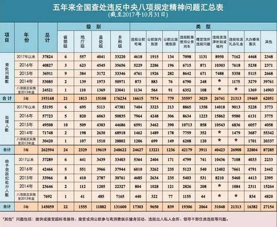 30日,中央纪委监察部网站公布中央八项规定实施五年以来的“成绩单”。数据显示,截止2017年10月31日,全国已累计查处违反八项规定精神问题193168起,处理262594人,给予党政纪处分145059人。