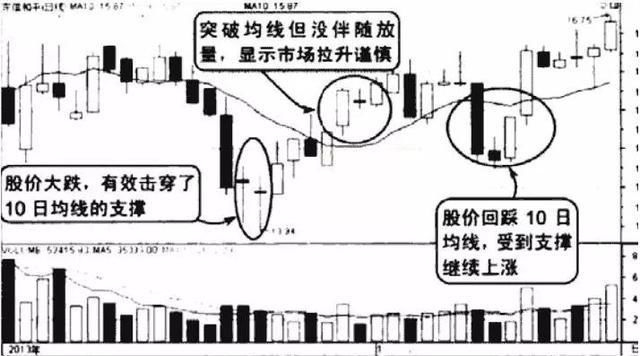 强势放量突破10日均线,股价一般会持续维持上涨。若股价谨慎性突破10日均线,市场将对10日均线进行同踩确认,这也将是个短线获利良机。