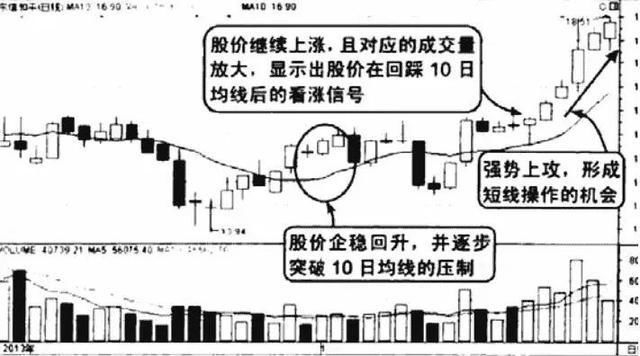 果然,当股价回踩10日均线后伴随成交量的放大,股价继续商扬。由此显示后市看涨,投资车适时售出股票即可获利。