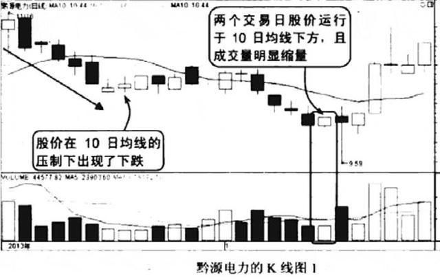从图中可以清晰地看出,该股在10日均线的压制下运行,且股价出现了快速的下跌。之后该股触底反弹,股价强势上涨,接着向上运行并逐步接近10日均线,但10日均线没有形成有力支撑。