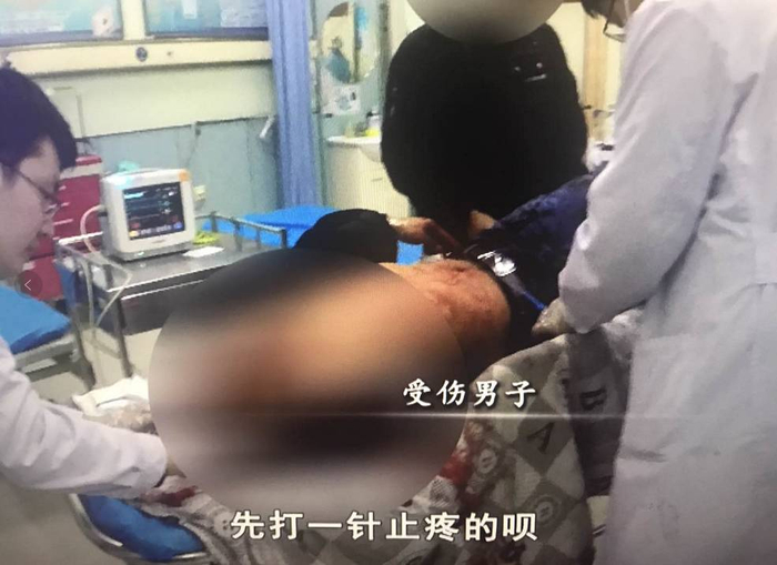男子的家属说,当时他没在现场,不知道发生了什么,等他赶到时,男子就倒在了血泊中,家人就立刻报警并拨打了120急救电话。在急救车上,急救医生初步处理了伤口,到了急诊室,血已经浸满了纱布,急救医生就需要再次进行伤口处置,然后再送男子去拍片看看是否有骨折或内出血等其它方面的症状。