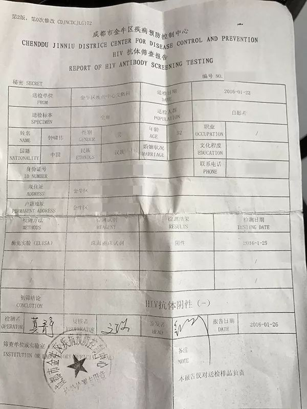 钟啸伟告诉记者,因为“等死”的7年间他身体无任何艾滋病人症状,于是他于2015年12月25日到四川大学华西医院实验医学科抽血检查,结果显示其HIV抗原体复合检测为阴性。他将此情况反馈给金牛区疾控中心,经查仍为阴性。