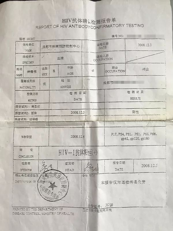 2008年的《HIV抗体确认检测报告单》证实,钟啸伟的血样2008年12月2日送检,送检单位为成都市疾控中心,确认单位是四川省疾控中心。报告单备注一栏注明“本报告仅对送检样品负责,身份证号不详”。