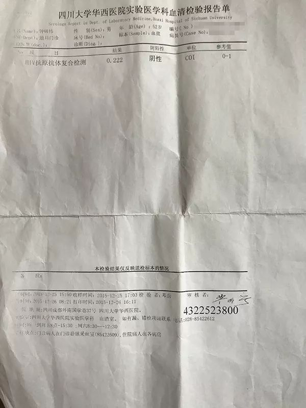 2015年12月25日,钟啸伟抱着试一试的想法前往华西医院实验医学科抽血检测。次日,当他拿到检测结果后彻底乱了套——HIV抗原体复合检测结果为阴性。