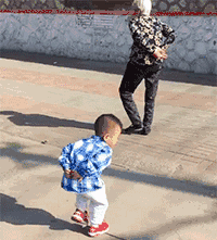 爸妈训娃,爷奶在后。