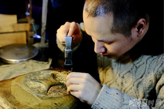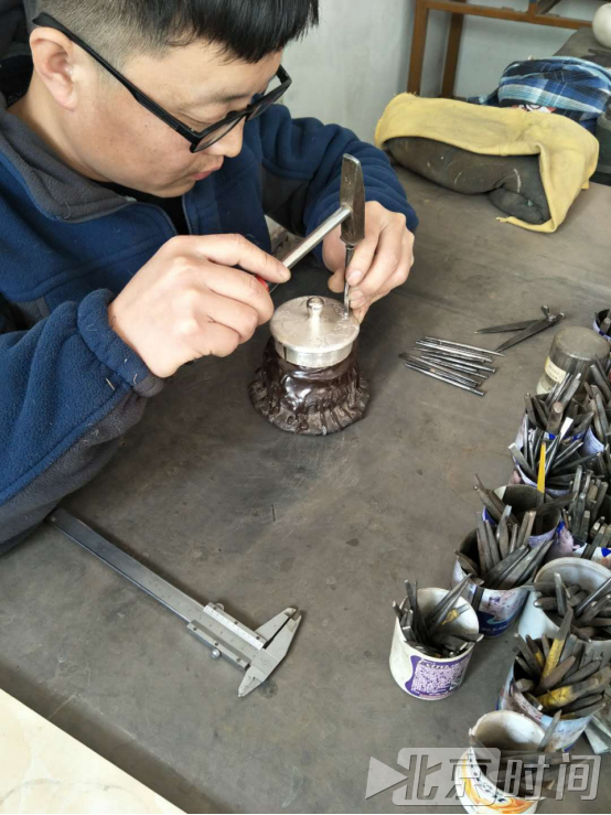 “錾(zàn)刻是门很有个人风格的艺术,你仔细看会发现每位师傅手上的錾子都不同,这行的工具买不着,都得自己做,从工具开始就有了你自己的特色,所以这行特讲究师承。当然师傅领进门,修行靠个人,虽然是一门古老的艺术,但随着社会的变迁一直在变化。比如以前有一种錾刻蒙镶,它刻出来的发丝就有一种粗犷的感觉,而现在的头发丝都很细腻,符合现代人的审美标准,所用到的錾子也从3-4根,到现在的8-9根。”张长征对北京时间记者说。