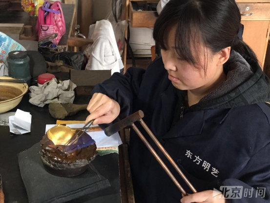 来自北京市工艺美术高级技工学校的郭瑞婷是个97年出生的内蒙女孩,主要跟着师傅做摆件、花丝镶嵌的盘子、孔雀、香薰炉这些观赏性的器物。郭瑞婷说,当初选择这个专业就是觉得这个名字很美,当时班里有十几个同学学这个专业,但最后坚持下来的只有两个人。自己能够坚持下来不光是因为太喜欢这个专业,也因为自己觉得传统工艺美术是需要年轻人去传承的。