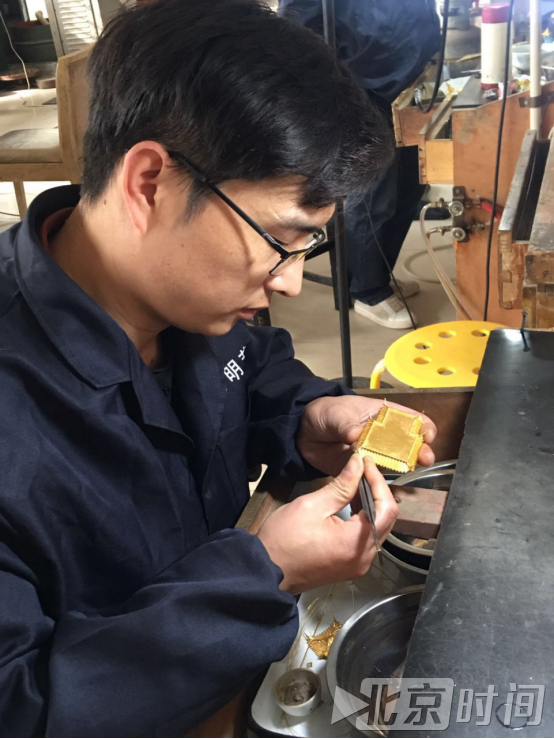 1972年出生的李金海是位土生土长的北京人,1991年进入北京花丝镶嵌厂工作,主要做錾刻工作,师从工艺美术大师杨锐。