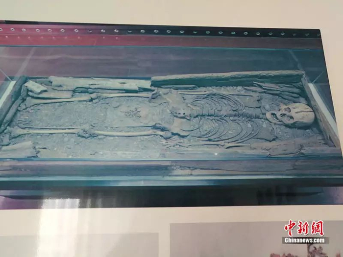 棺木内葬有一个青年女子,遗体身材高大,年纪大约在25岁,此女额骨扁平,与《大唐西域记》中记载的古龟兹人生子“以木压头欲其扁”的习俗相吻合。青年女子身上有一堆小骨头,是个婴儿的遗骨。