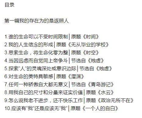 比如《生命的光影形线:人生感想录》《古人为何要留胡子:谈艺论文录》这两本都是沈从文的文集,书名看上去还算正常,但看过目录才发现,很多文章的标题都被改过了。下面选取最具代表性的《生命的光影形线:人生感想录》一书目录,诸位可以充分感受一下“标题党”的冲击力。