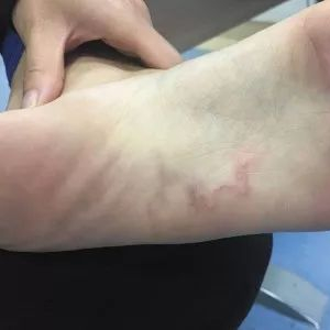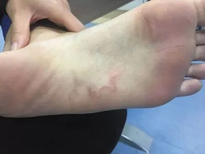 辽宁大连一对新婚夫妻到泰国度蜜月,回国后没几天,年轻妻子发现脚底又痛又痒,脚底皮肤出现了弯曲的红线。