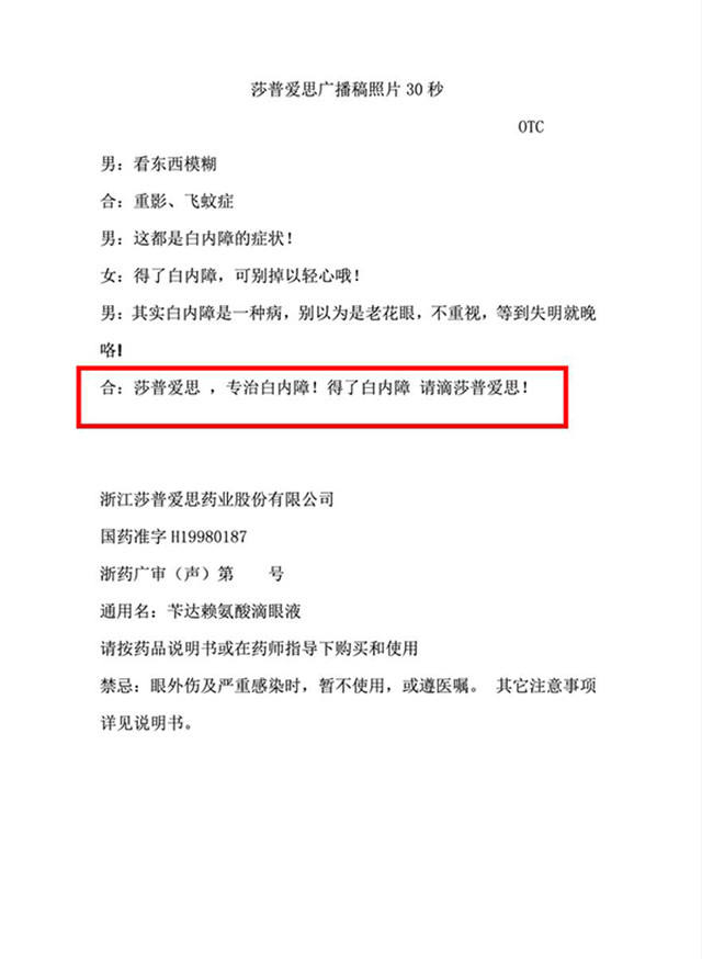对此,王金宝称此举涉嫌欺骗、误导消费者,“不明显标注或通过旁白呈现的都是不对的,白内障的发病原因有多种,包括老年性、并发症性、外伤性、代谢性等,而只有早期老年性白内障才可以使用该药,该药品明显含有虚假或引人误解的内容。”