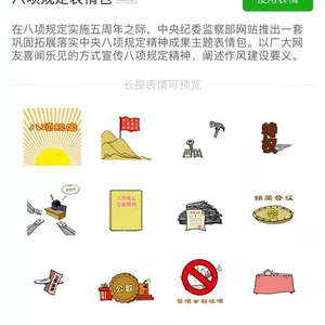 据悉,该套表情包一经推出,首日点击数就已超百万。据中央纪委监察部网络中心监督执纪信息处有关负责人介绍,12月4号正值八项规定实施五周年,所以选择在此时推出这款表情包。