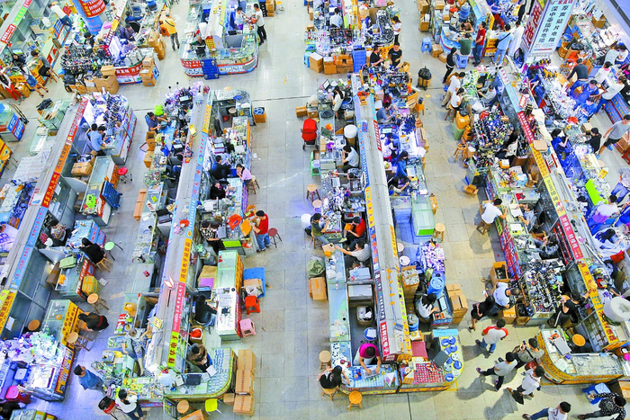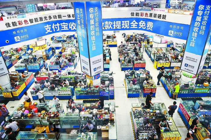 凭借上下游供应链、人气的交汇等,华强北借助互联网,使许多原本不起眼的小宗商品,占据了与畅销品匹敌的市场份额。图为华强北电子市场。 深圳报业集团资料图
